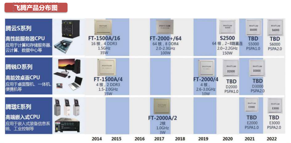 通过20年技术积累,飞腾已经形成完整的多样化算力产品谱系,是国内通用CPU里面谱系非常全的CPU厂家。包括高性能服务器CPU、高效能桌面CPU、高端嵌入式CPU,能为从端到云的各类设备提供核心算力支撑。目前,主推产品是面向服务器的S2500、FT 2000+/64,面向桌面终端的FT2000/4和面向嵌入式的FT2000A/2。