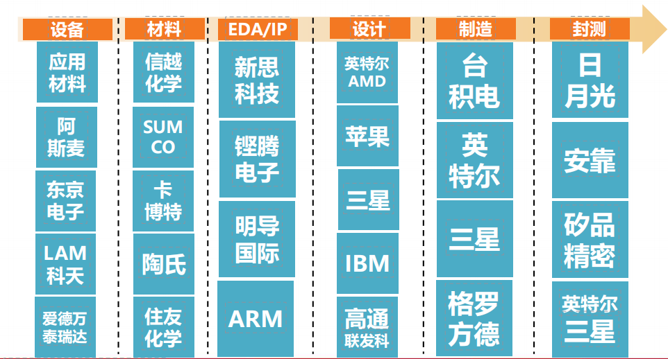 CPU产业链的巨头大多集中在海外,它们位居产业链各个环节核心,对全球CPU行业起着决定性的作用。设计环节:英特尔和AMD几乎垄断通用型CPU的市场;设备、材料、EDA/IP等环节国内龙头与国外龙头差距较大,国产化率较低;制造环节:目前只有台积电和三星有5nm制程生产能力,但均需使用美国设备;封测环节:目前中国台湾、中国大陆、美国三分天下。