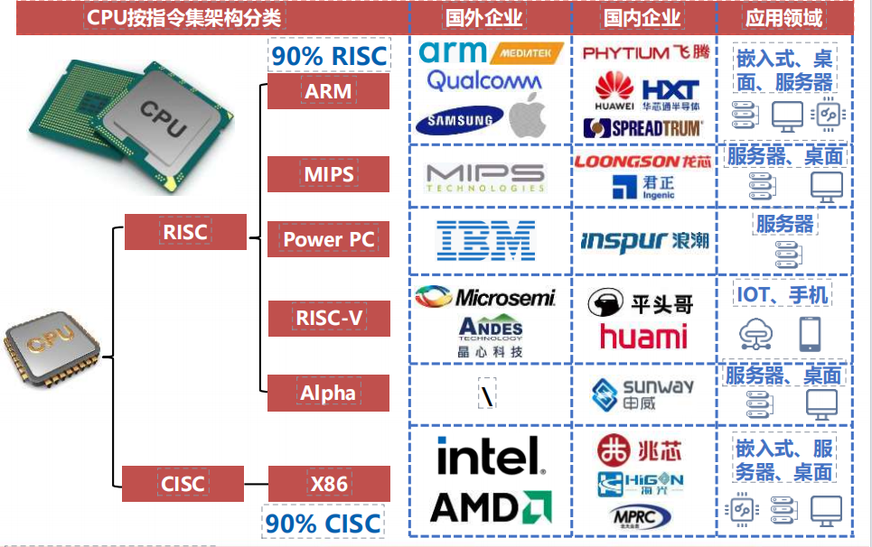 总结:目前国产CPU主要需求来自服务器、政企、工业等市场,鲜少出现在消费级市场。我们认为基于安全的自主可控是推动国产CPU成长的主要力量,且基于架构的差异性带来的应用不同,我们认为指令集架构不会直接消亡,不同架构都会衍生出行业龙头,考虑通用CPU等格局极为稳固,可关注物联网以及汽车等新兴领域。
